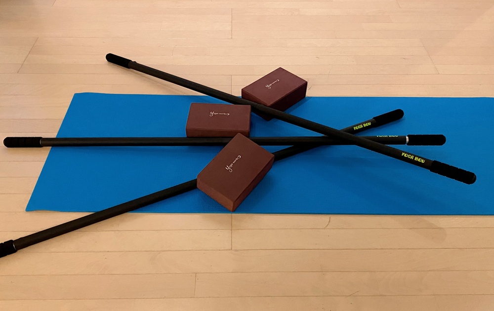 ヨガ棒以外にヨガブロックやヨガベルトを使用しながら